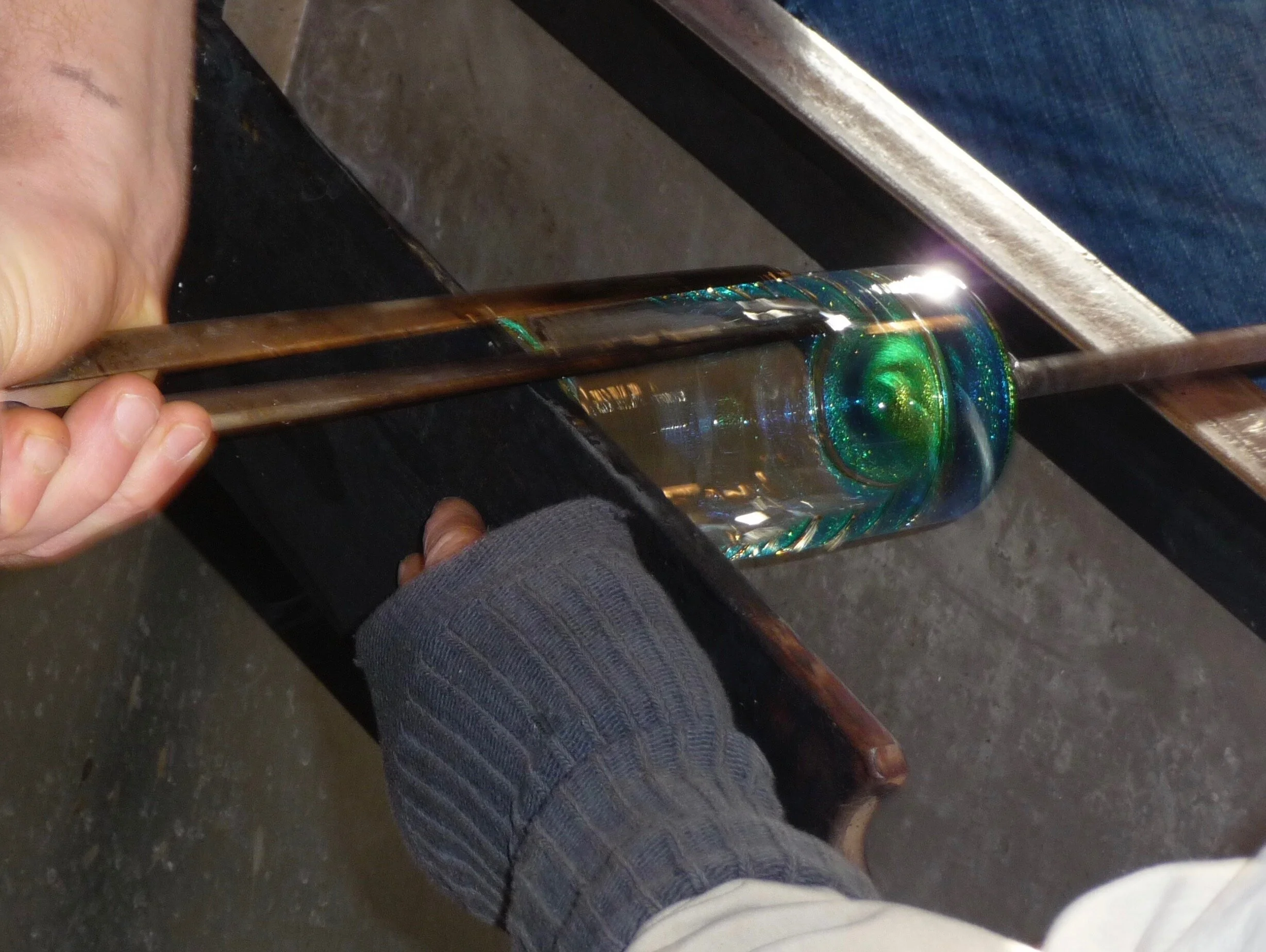 Next, we sandwich pieces of color-shifting dichroic glass in the base. The glass cylinder is transferred from its initial blowpipe to a secondary metal rod, reheated, and opened up to create a finished drinking glass.